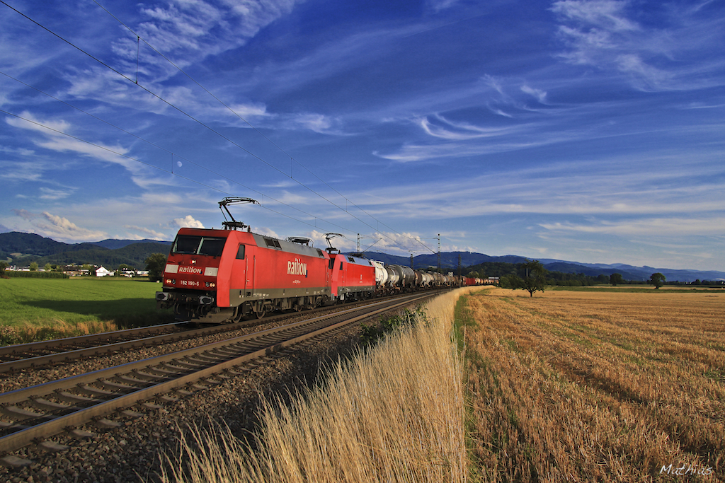 FOTO 1: Ich war in letzter Zeit mit meiner neuen Kamera auf Fototour. Hier das erste Ergebnis: Im letzten Licht des 11. Juli 2011 fährt die 152 190-5 mit einer weiteren 152 auf der KBS 703 (Basel- Offenburg) mit einem Güterzug gen Norden. Das Foto entstand bei Kollmarsreute.