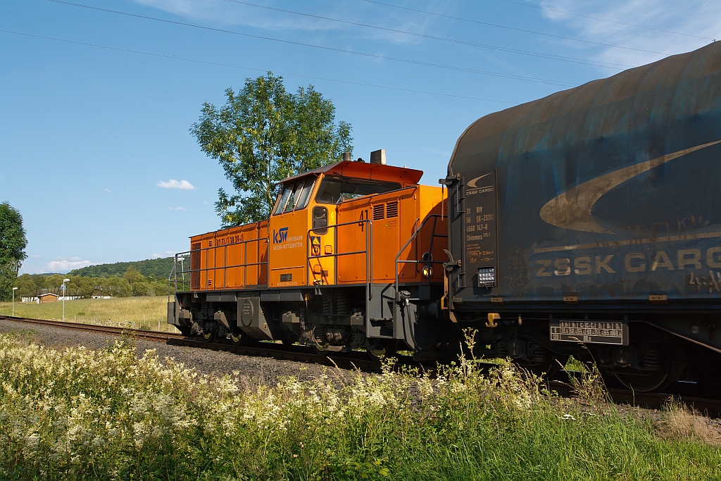Lok 41 (MaK DE 1002) der Kreisbahn Siegen-Wittgenstein (KSW) fährt am 05.07.2011 in Neinkirchen-Struthütten mit einem Güterzuges (beladen mit Coils), auf KSW eigenem Gleis Richtung Neunkirch-Salchendorf.
