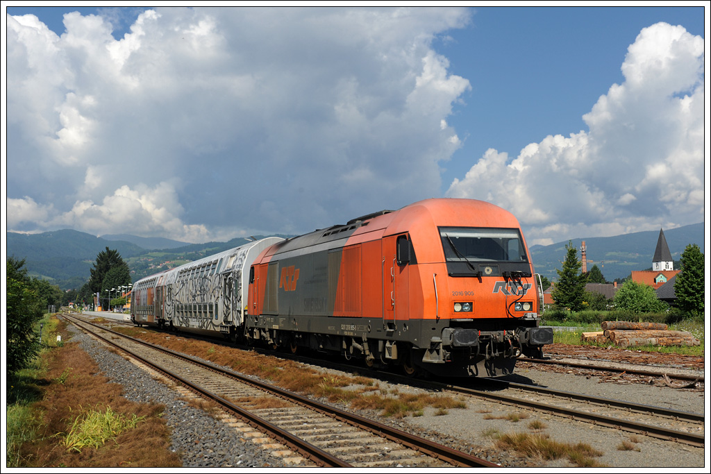 RTS 2016 905 mit dem als S6 verkehrenden R 4366 von Wies-Eibiswald über Werdorf nach Graz, am 27.7.2011 bei der Ausfahrt aus Frauental aufgenommen.