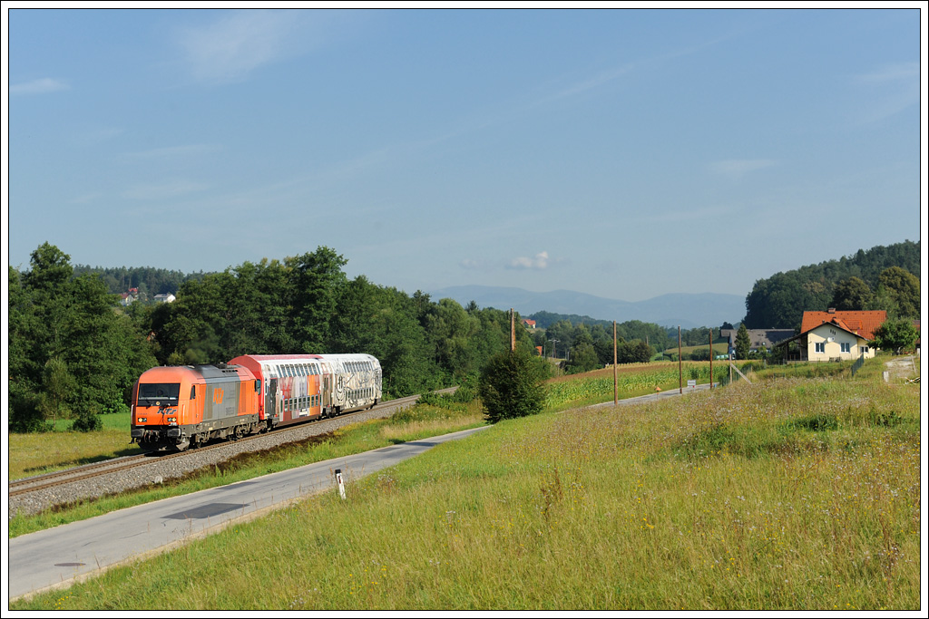 LTE 2016 903 mit dem als S6 verkehrenden R 4363 von Graz über Werndorf nach Wies-Eibiswald am 27.7.2011 kurz nach Deutschlandsberg auf der Leibenfelder Höhe aufgenommen.