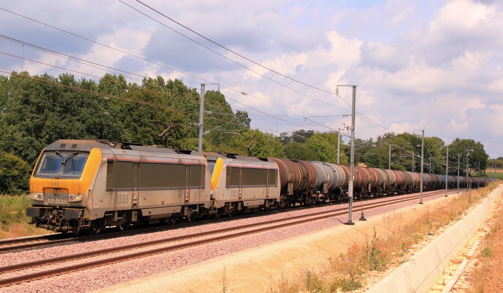 Hier ziehen zwei belgische 13er den Spritzug aus Luxemburg nach Antwerpen. Dippach 25.juli 2011.