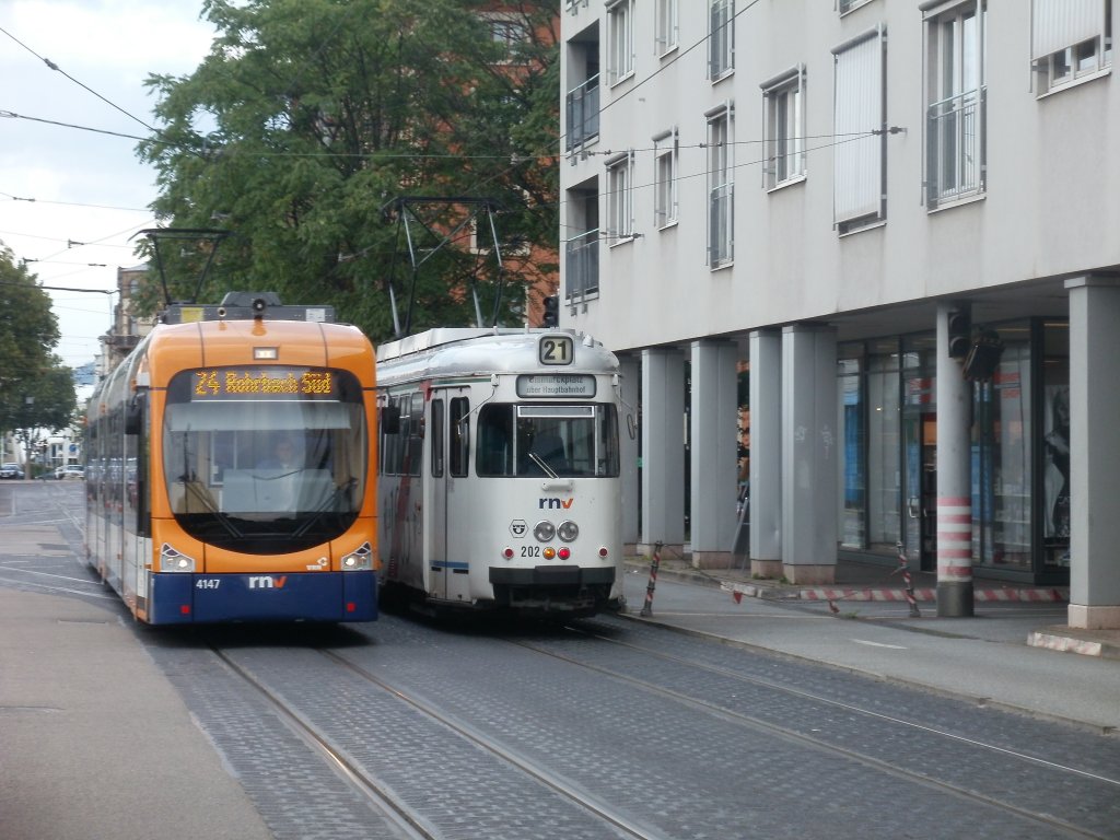 Tw 4147 und (3) 202 treffen sich kurz vor dem Betriebshof in Heidelberg 27.07.2011