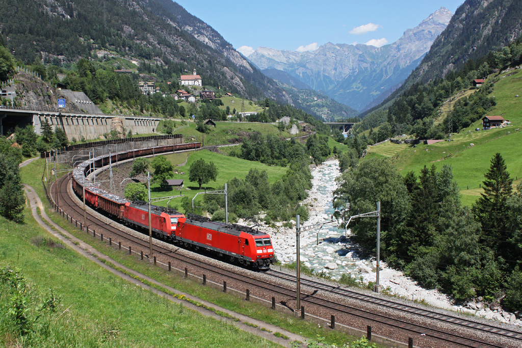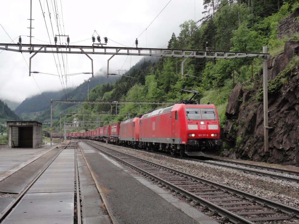 185 120 und eine Schwesterlok mit einem Güterzug am 27.06.2011 auf der Gotthard Strecke bei Wassen.