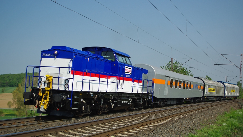 203 841-2 mit interessantem Anhängsel begegnete mir am 30.04.2011 zwischen Friedland(HAN) und Eichenberg in Fahrtrichtung Süden. Wie sich später herausstellte, wurde die Lok und die Wagen auf der Münchner Messe ausgestellt.