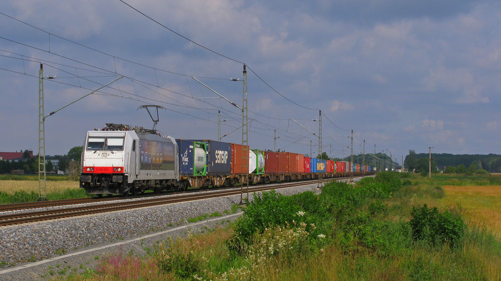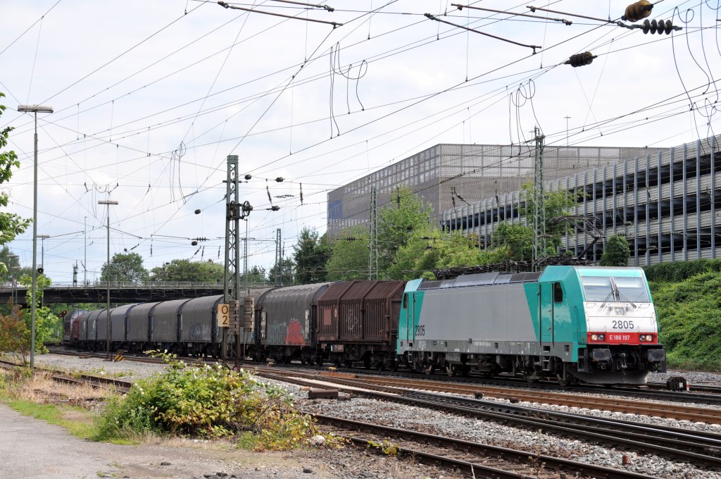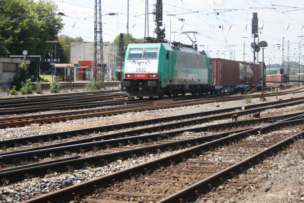 Seit langem mal wieder eine Captrain-Lok gesehen und dann auch noch unter so widrigen Umständen: 186 150 schleicht sich aus der Eichenberger Ost-Nord-Schleife in Richtung Norden. Aufgenommen am 30.04.2011.