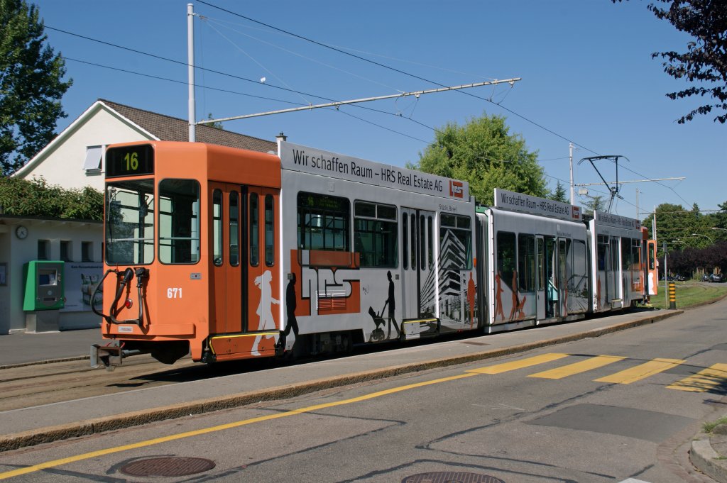 Motorwagen 671 mit der Vollwerbung für die Firma Real Estate AG auf dem Bruderholz in Basel. Die Aufnahme stammt vom 03.07.2011.