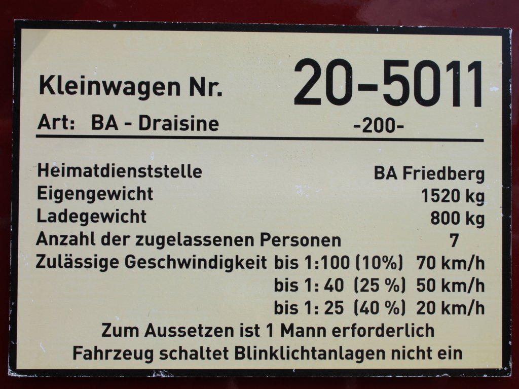 Typenschild der VW T1 Draisine 20-5011 am 03.07.2011 beim Bahnhoffest in Walheim, das von den Eisenbahnfreunden Grenzland veranstaltet wurde.