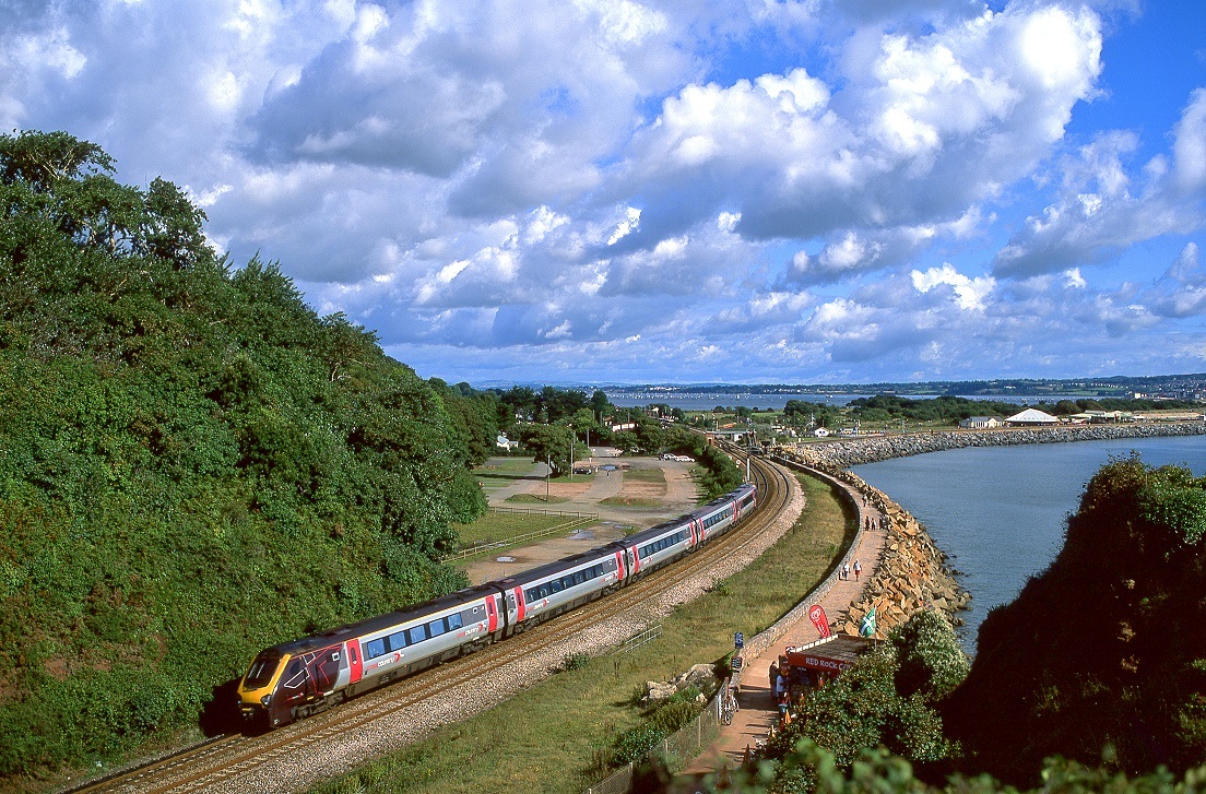 Cross Country 221 121 mit 09.30 Paignton am Red Rock bei Dawlish Warren, 28.08.2010.