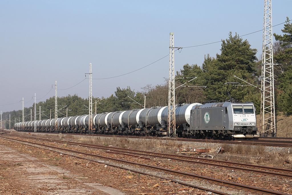 185 018-9  am 18.06.2011 mit einem kurzen Güterzug von 12 Kesselwagen die laut UN Nummer alle mit  Xylene beladen waren (1307) nach der Durchfahrt durch den Bahnhof Berlin Schönefeld Flughafen.