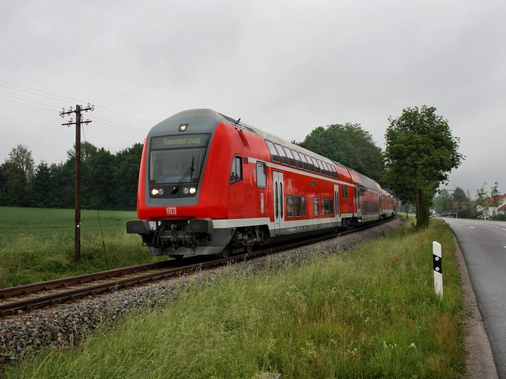 Ein Sonderzug von Pfarrkirchen nach Augsburg am 28.05.2011 unterwegs auf der Rottalbahn bei Massing.