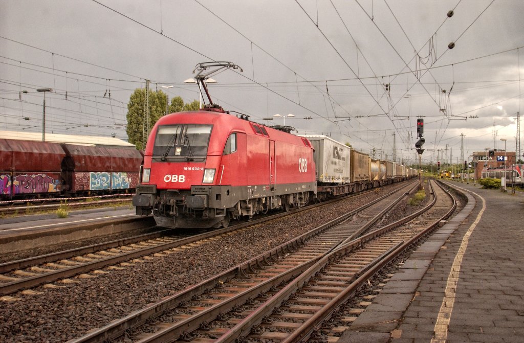 Die 1216 953 am 19.06.2011 mit einem Containerzug unterwegs bei Hausbach.
