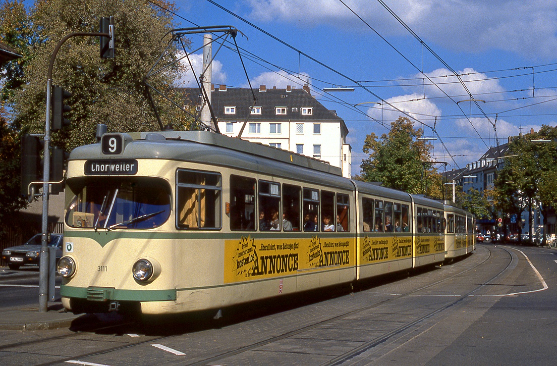 Köln Tw 3111 und 3126 auf der Sl 9 in Deutz am Gotenring, 01.10.1988. Die Sl 9 war damals die einzige Linie, die von Achtachsern in Traktion bedient wurde.