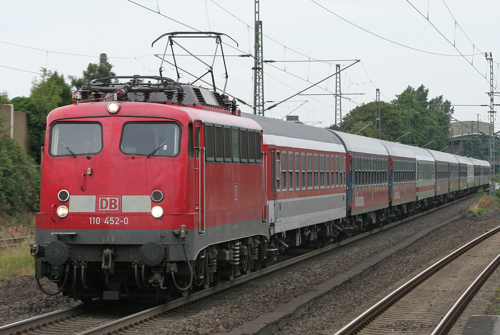 Die 110 452-0 zieht den bunten WDR Schlagerexpress von Brilon Wald ab Dortmund Richtung Köln durch Duisburg Schlenk am 19.06.2011