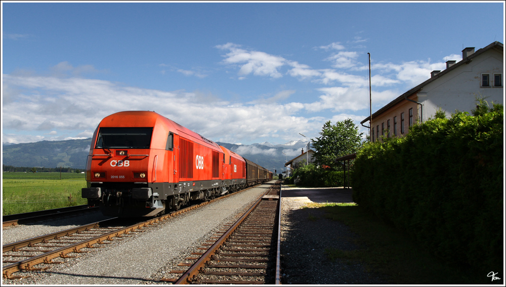 Die beiden Dieselloks 2016 055 + 054 ziehen den Holzzug 55555 von Zeltweg nach Frantschach.