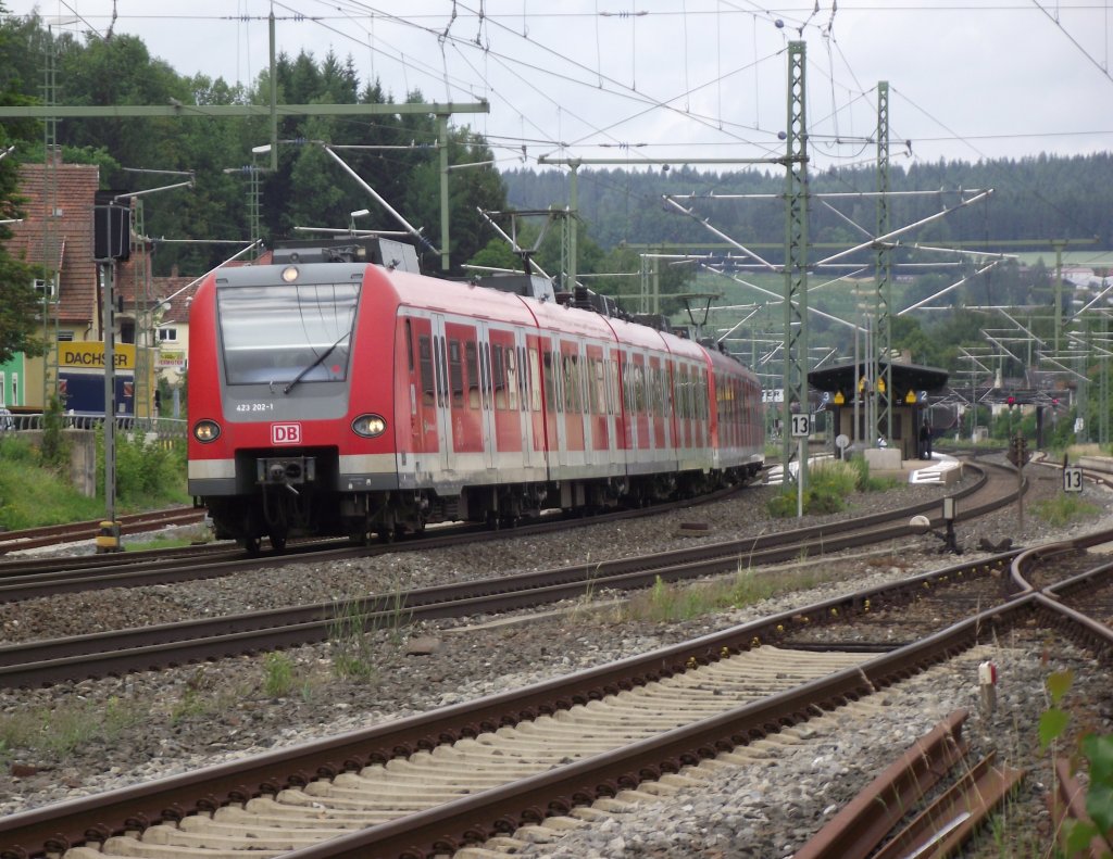 423 202 und 423 123 der S-Bahn München durchfahren am 21. Juni 2011 den Kronacher Bahnhof über Gleis 3.