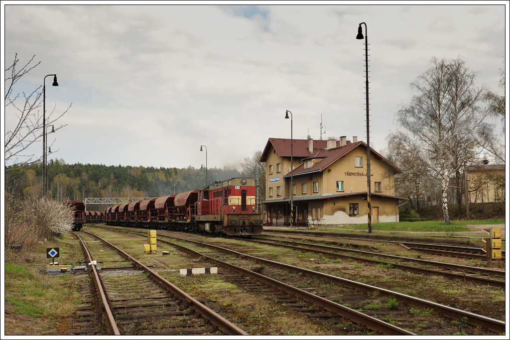 742 190 an der Spitze dieses Güterzuges, aufgenommen am 16.4.2011 bei der Ausfahrt aus Třemo¨ná (deutsch Tschemoschna).