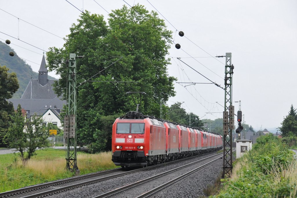 Lokzug mit 12 Loks, gezogen von 185 023-9, rollt durch Leutesdorf Richtung Norden. Aufgenommen am 25/06/2011.