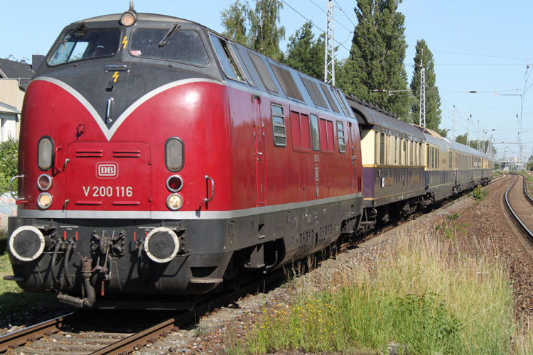 Abschied nehmen hieß es am 29.06.2011 von V 200 116 mit Nostalgie-Ostsee-Express als DPE 334 von Warnemünde nach Köln Hbf,als sie den Haltepunkt Rostock Holbeinplatz passiert hat.