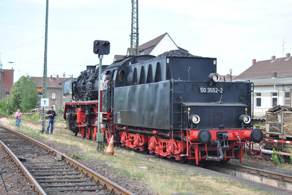 Hier sieht man eine BR 50 in Darmstadt Kranichstein. Diese Lokomotive gehört den Eisenbahnfreunden aus Hanau. Sie war anlässlich des 35 Jährigen Jubileums des Eisenbahnmuseums in Kranichstein da.Aufgenommen am 03.06.2011.