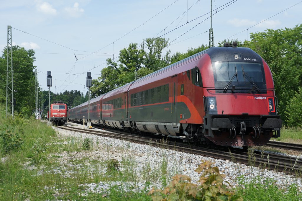 Ein Railjet überholt 111 043-6 mit ihrem RE nach Salzburg im Bahnhof Aßling am 31.05.11.