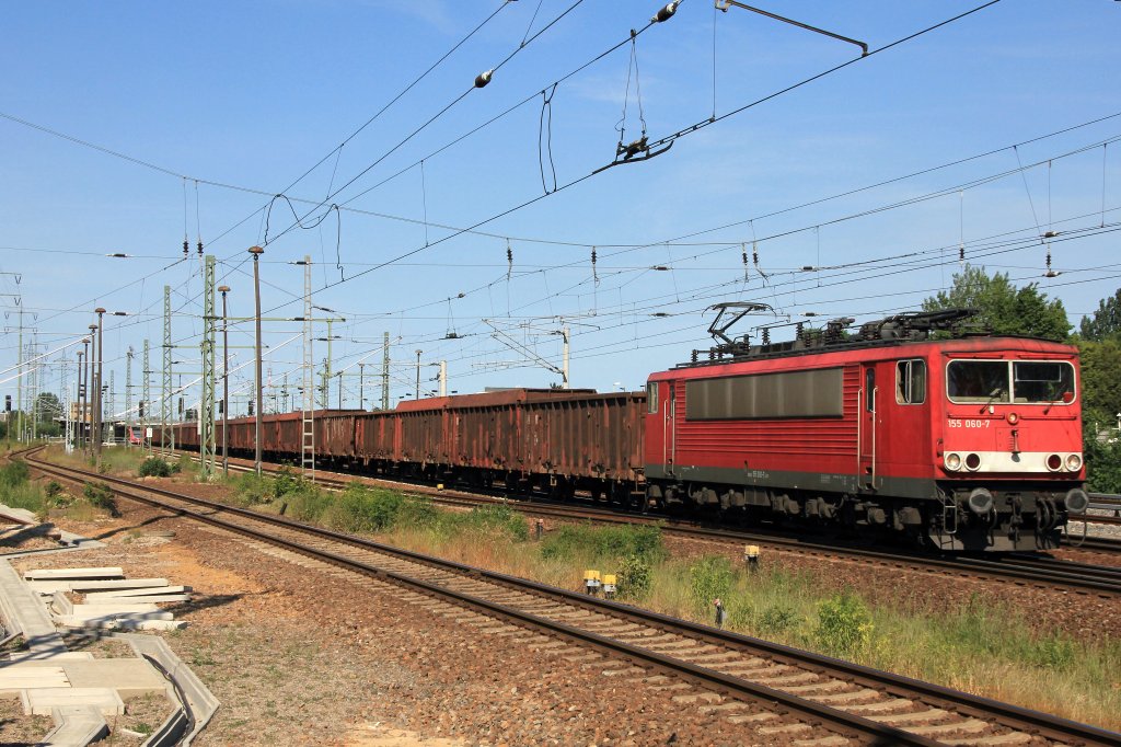 155 060-7 am 02. Juni 2011 mit einem Güterzug bei der Ausfahrt aus den Bahnhof Berlin Schönefeld Flughafen Richtung Genshagener Heide
