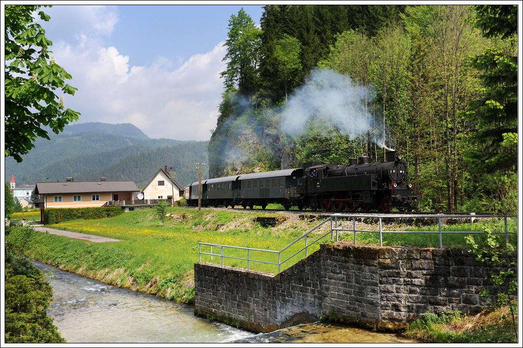ÖGEG 77.28 mit unserem Fotozug von St. Pölten nach Sankt Aegyd am Neuwalde am 13.5.2011 als Nebenfahrt 14518 von Sankt Aegyd am Neuwalde nach Markt St. Aegyd a/N kurz vor dem Streckenende.