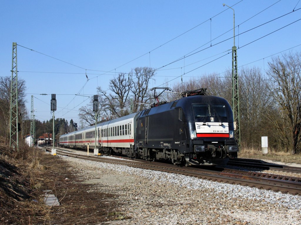 Die ES 64 U2-061 am 26.02.2011 mit dem IC Königsee bei der Durchfahrt in Aßling.