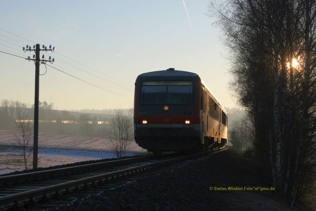 Ein Foto mit den ersten Sonnenstrahlen hinter Rehau, wo noch Telegrafenleitung an der ehemaligen Hauptstrecke existiert. 628 249 kommt am 25.02.2011 aus Selb herein und in 2-3 Minuten in Rehau halten.