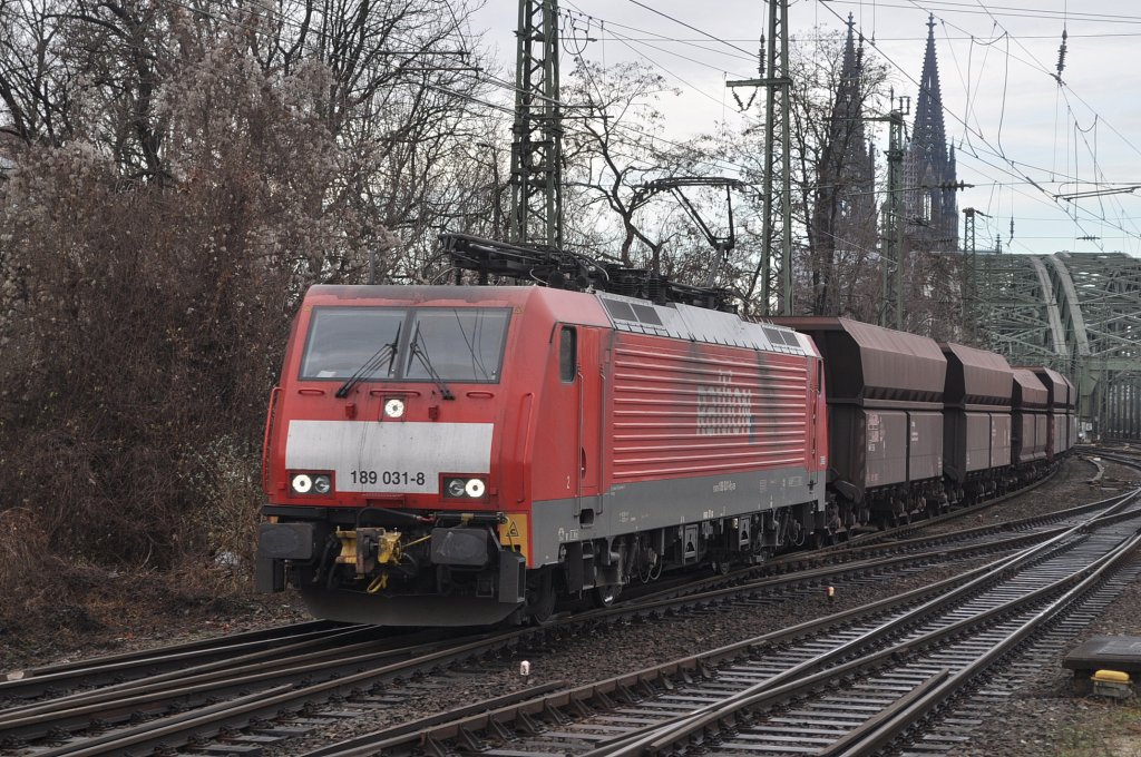 185 399 und 185 xxx am 7.3.11 mit einem Kohlewagenzug am Bopparder Hamm.