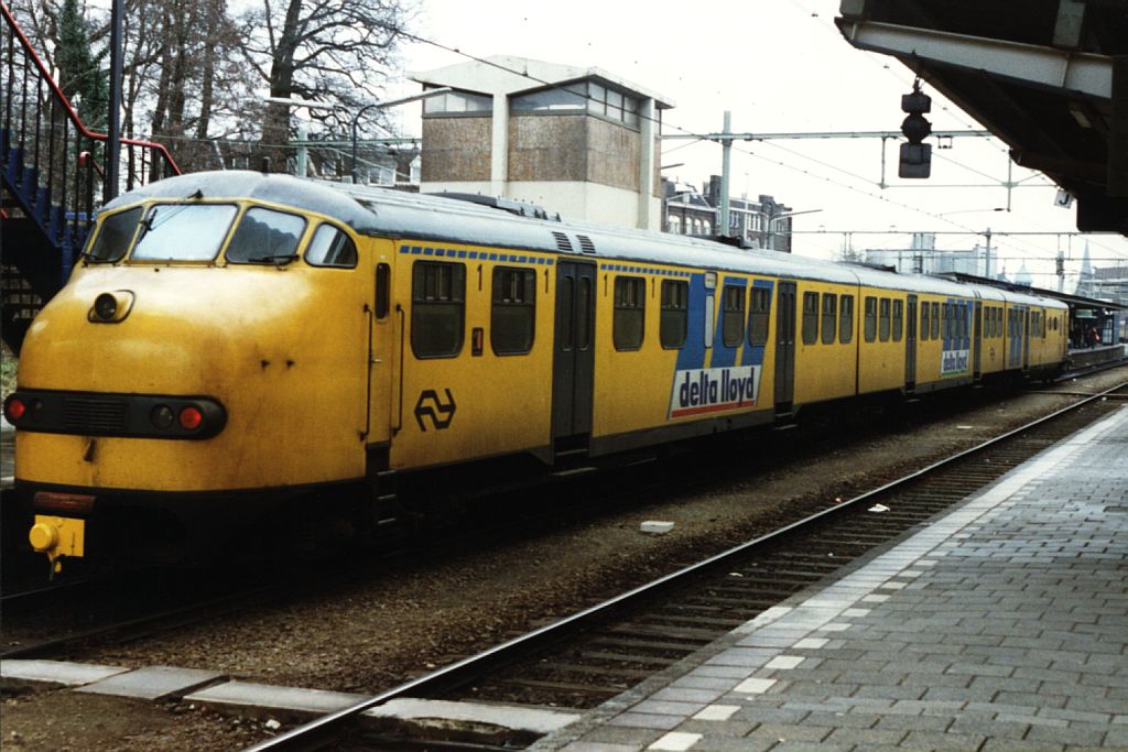 DE3 144 (im Hintergrund die 144) mit Regionalzug 7745 Arnhem-Doetinchem auf Bahnhof Arnhem am 8-3-1996. Bild und scan: Date Jan de Vries.
