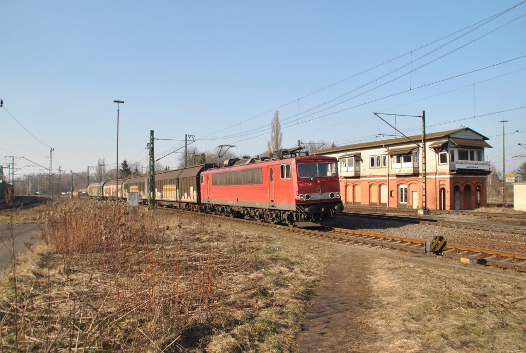 155 146 zieht am 05.03.11 einen Autoteilezug aus Engelsdorf kommend vorbei am Leipziger Messebahnhof.