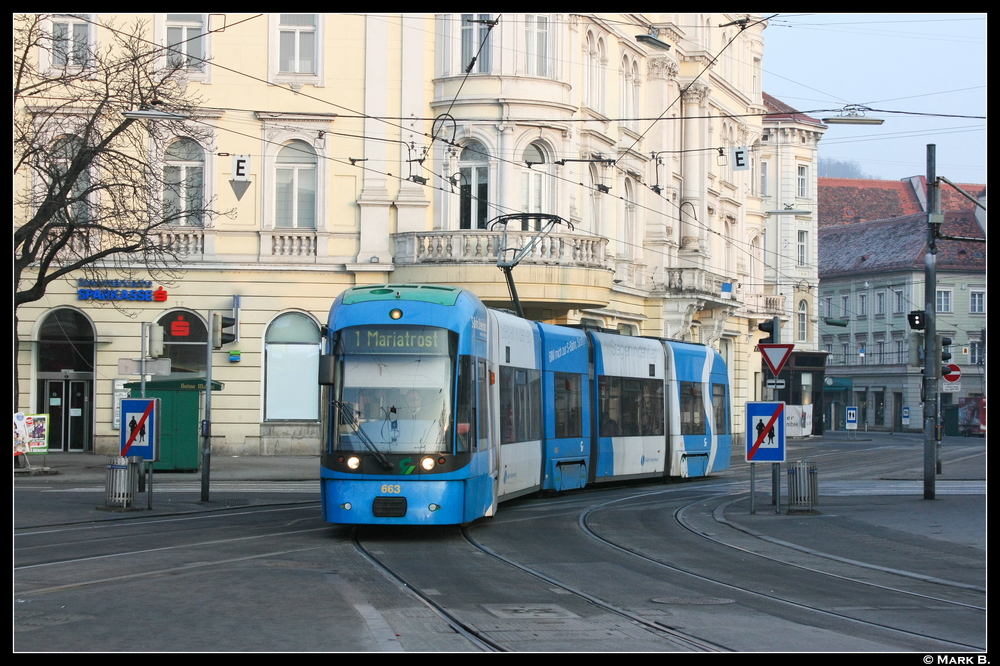Am morgen des 06.03.11 hat der Cityrunner 663 auf der Linie 1 den Jakominiplatz erreicht.