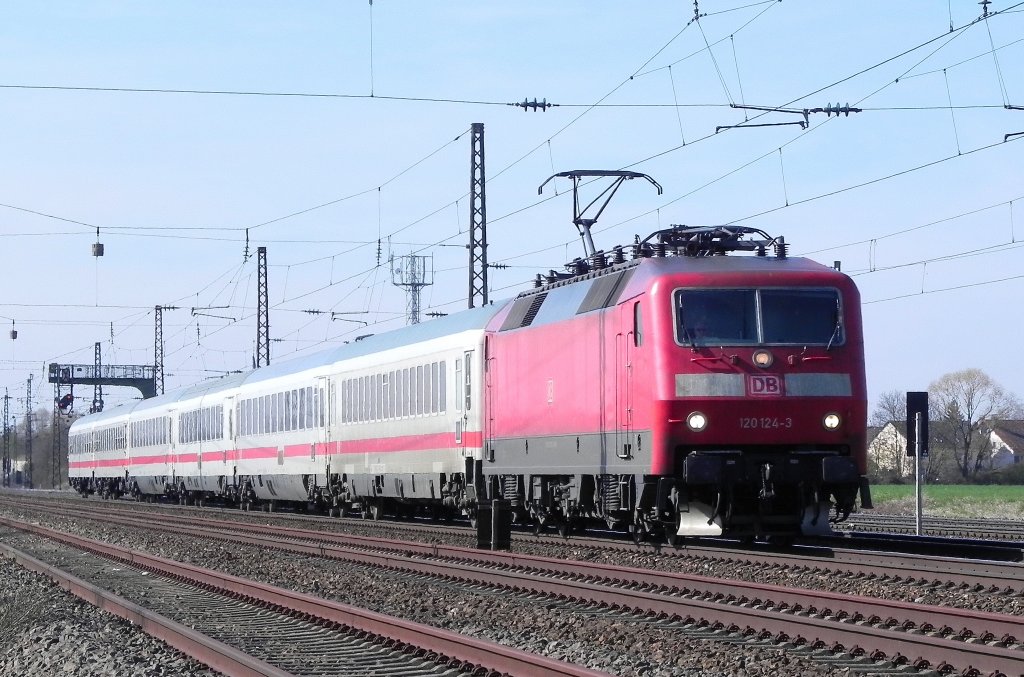 120 124-3 zieht am 20.03.2011 um 14:33 Uhr den IC 2255 Saarbrücken - Stuttgart zwischen MA-Friedrichsfeld und Heidelberg. Das Foto ist vom Feldweg aus aufgenommen.