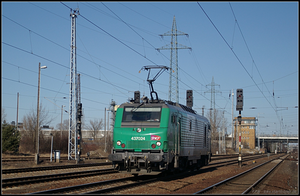 Solo ist die an ITL ausgeliehene FRET 437024 der SNCF unterwegs (gesehen Berlin Schönefeld Flughafen 19.03.2011)