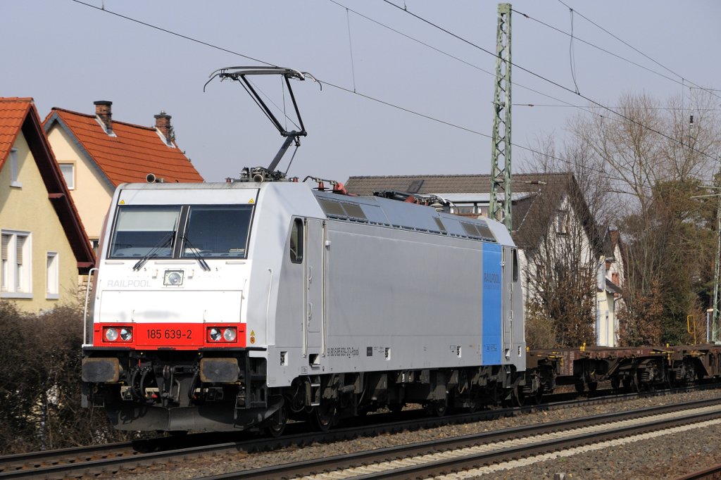 Für Railpool unterwegs: 185 639-2 mit einem leeren Containerwagen-Zug Richtung Heidelberg, die KBS 650 unter den Rädern. Blitzsauber in Durchfahrt Zwingenberg a.d. Bergstrasse. (12.03.2011)