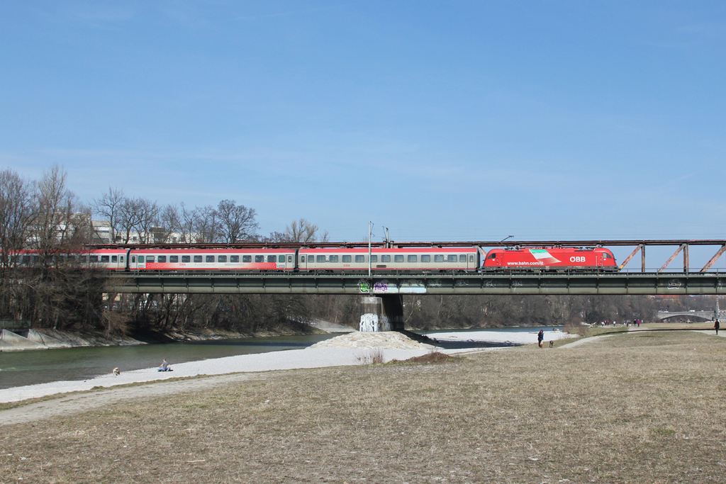 1216 018 mit EC 87 beim Überqueren der Isar in München.