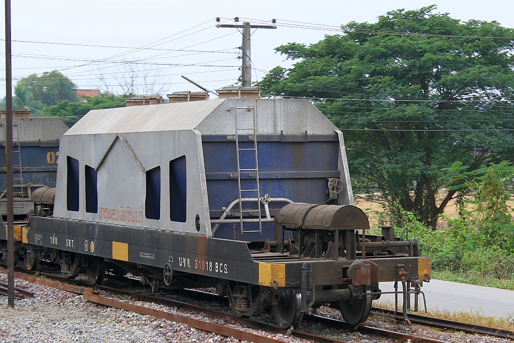 บ.ซ.ท.31018 (บ.ซ.ท. =B.C.S./Bogie Cement Hopper Wagon) im Bf. Mae Mo am 10.Jänner 2011. - Die Wagen der Reihe B.C.S.31001-31095 wurden von den SRT 1974 im Makkasan Workshop hergestellt.