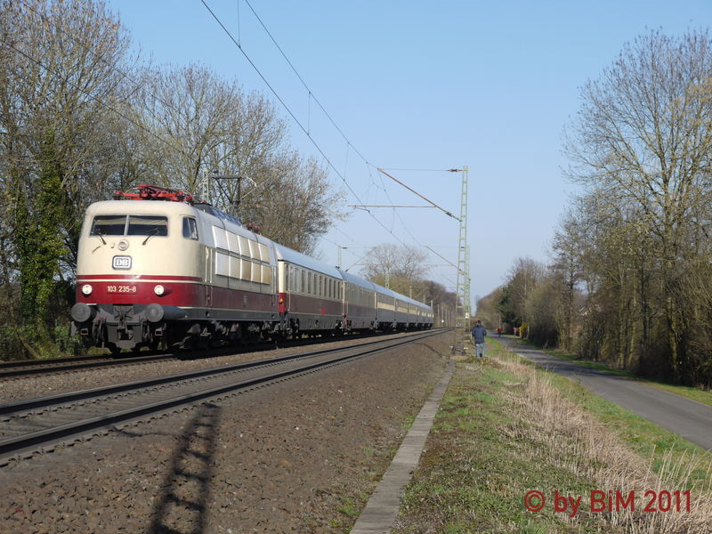 Mit leichte Verspätung fuhr die IC 2417aus Münster los weiter nach Köln. Schön präsentiert sich die 103 235 im Sonnenlicht, im Bösensell. 27.03.2011