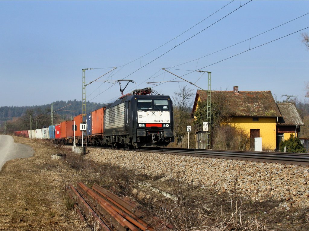 Die ES 64 F4-150 am 05.03.2011 mit einem Containerzug unterwegs bei Pölling.