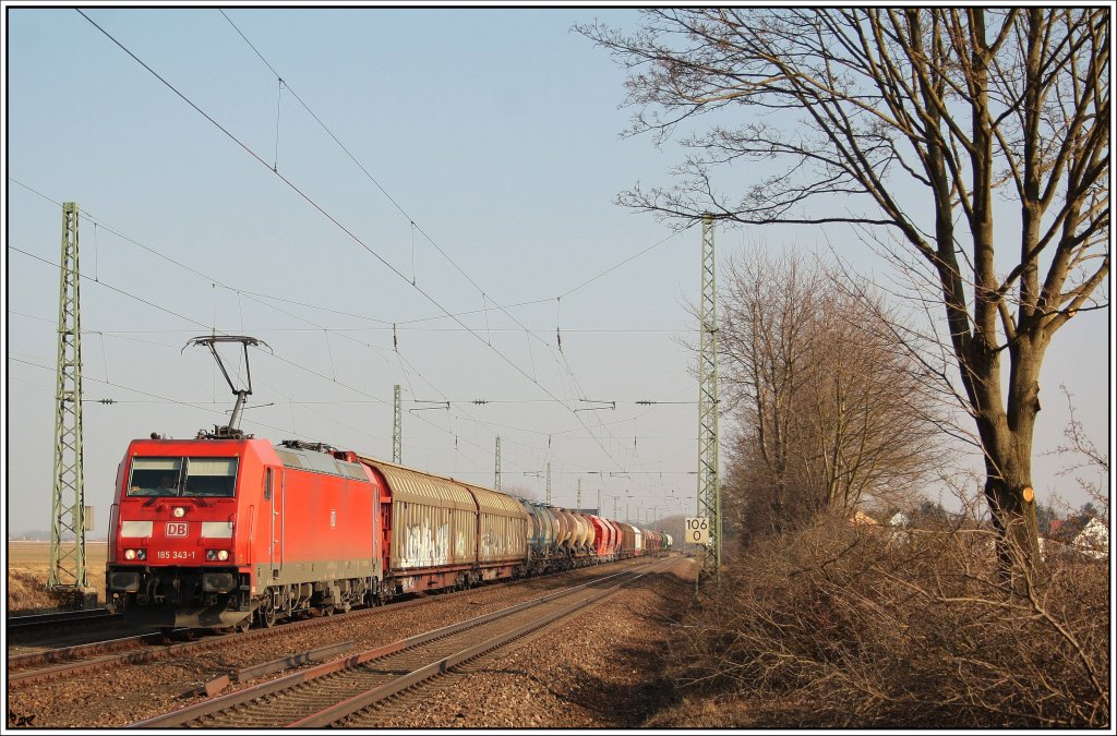 Auch zu genüge hatten wir von 185ern. Hier gerade 185 343 -1 mit einem Mischer Richtung Regensburg am Haken. (04.03.2011, Mangolding)