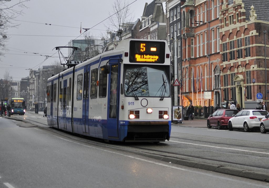 Die GVB 911 mit linie 5 nach Amstelveen hier am Nieuwezijds in Amsterdam am 12.02 2011.