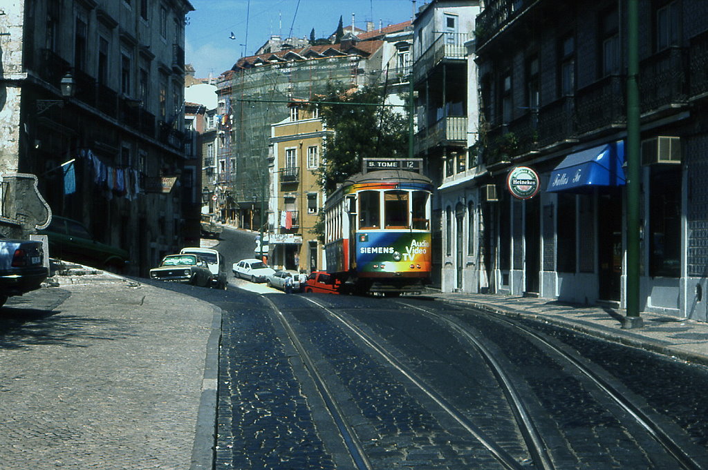 Lissabon Tw 717 auf einer Altstadt-Runde in der Rua de Sao Tomé, 13.09.1990.