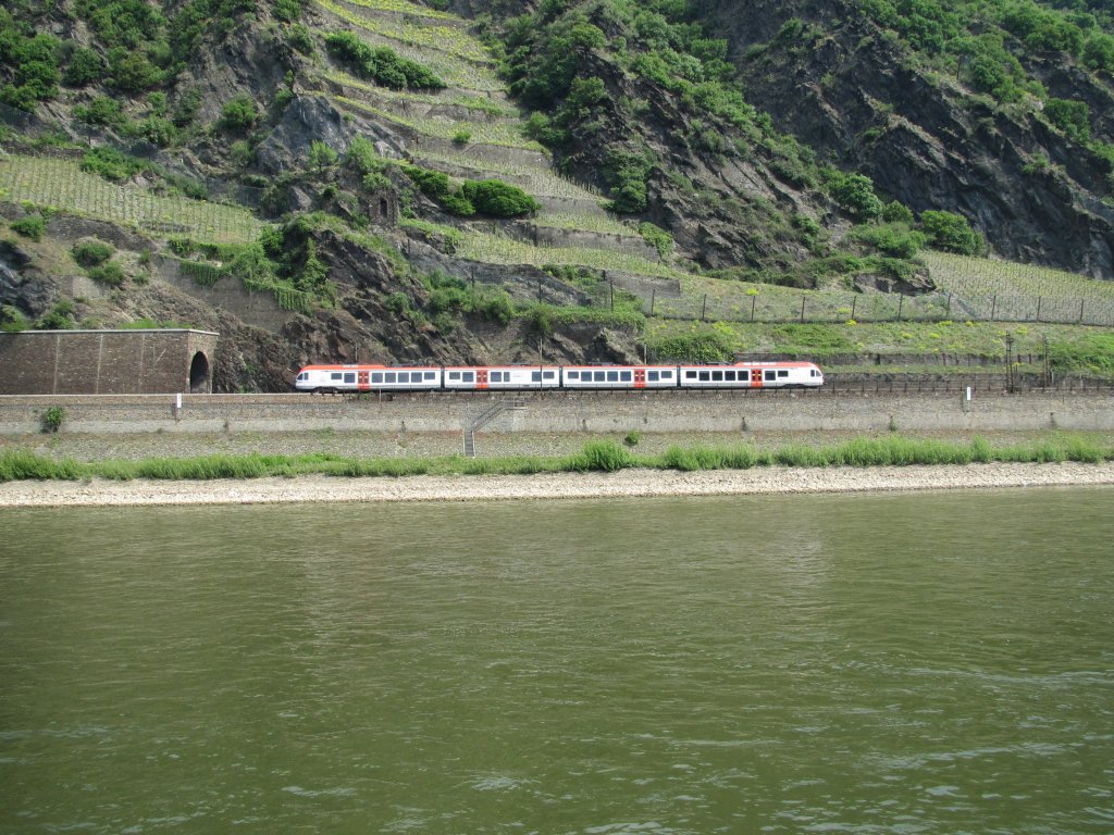1.5.2011 11:31 Eine Baureihe 428 der Vias Gesellschaft als VIA aus Frankfurt (Main) Hbf nach Neuwied auf der rechten Rheinstrecke zwischen Kaub und St. Goarshausen.