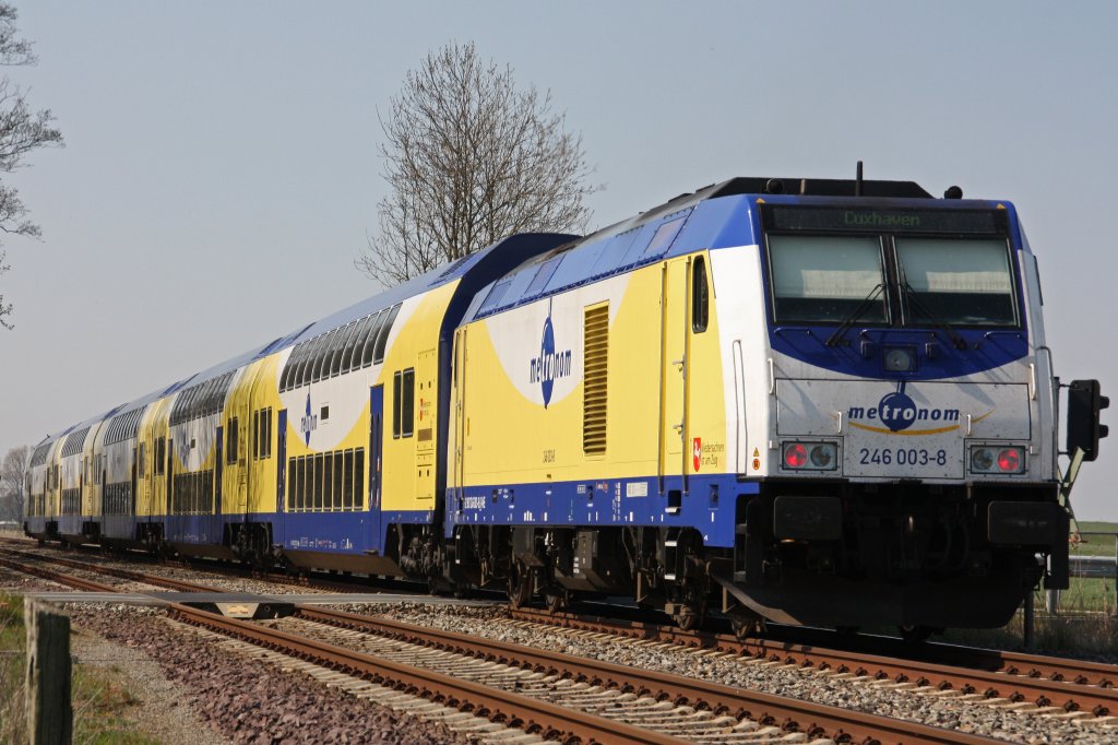 246 003 drückt am 24.4.11 einen Metronom nach Cuxhaven durch Weldorf.