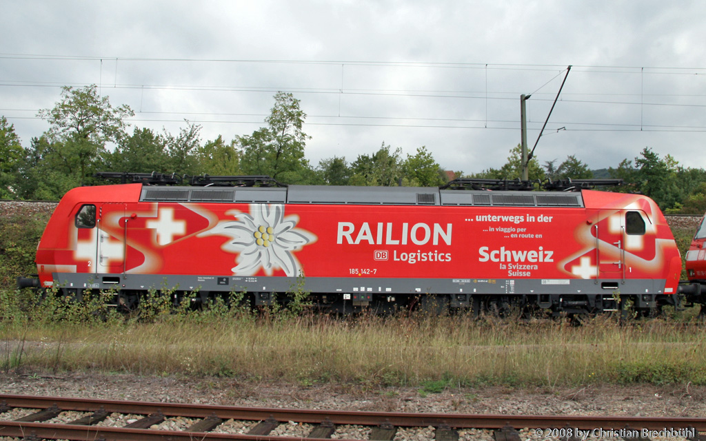 Diese Railion BR185 142-7 sollte mehrheitlich in der Schweiz unterwegs sein am 14.09.2008 in Haltingen abgestellt beim Unterhaltswerk der DB.