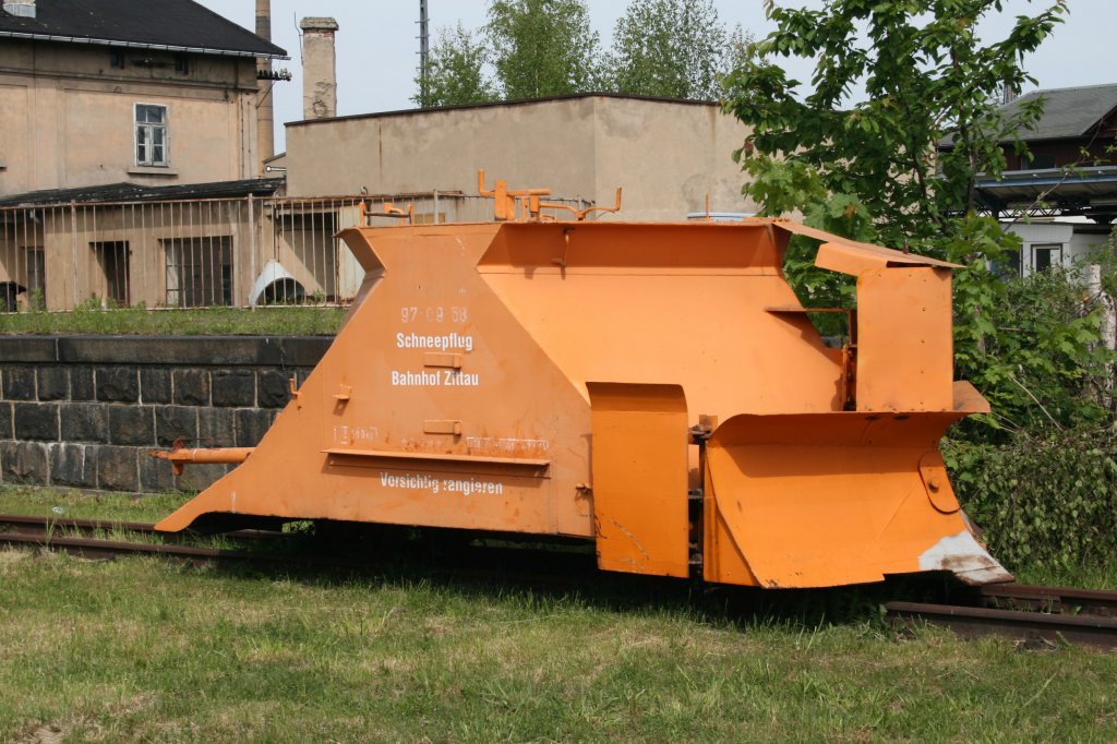 Schneepflug der Zittauer Schmalspurbahn abgestellt auf dem Bahnhof Zittau.14.05.2011.