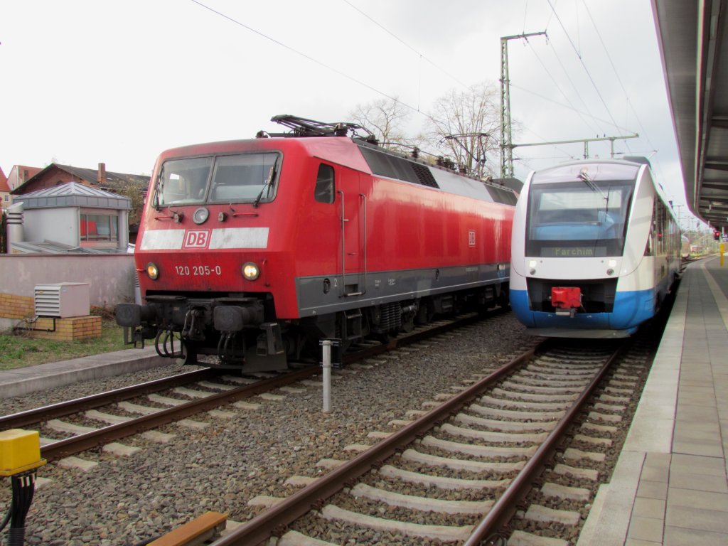 120 205 mit einem lerrreisezug und VT 704 der OLA im Bahnhof von Schwerin HBF am 12.04.2011
