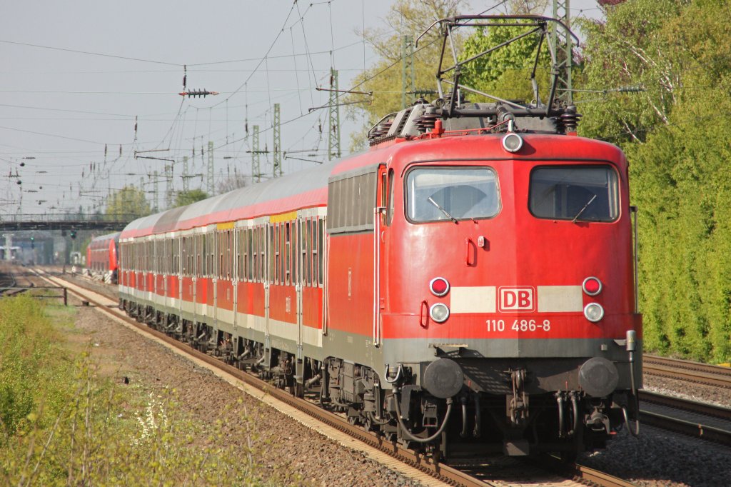 DB 110 486-8 drückt am 15.4.11 einen n-Wagen Park durch Düsseldorf-Angermund.