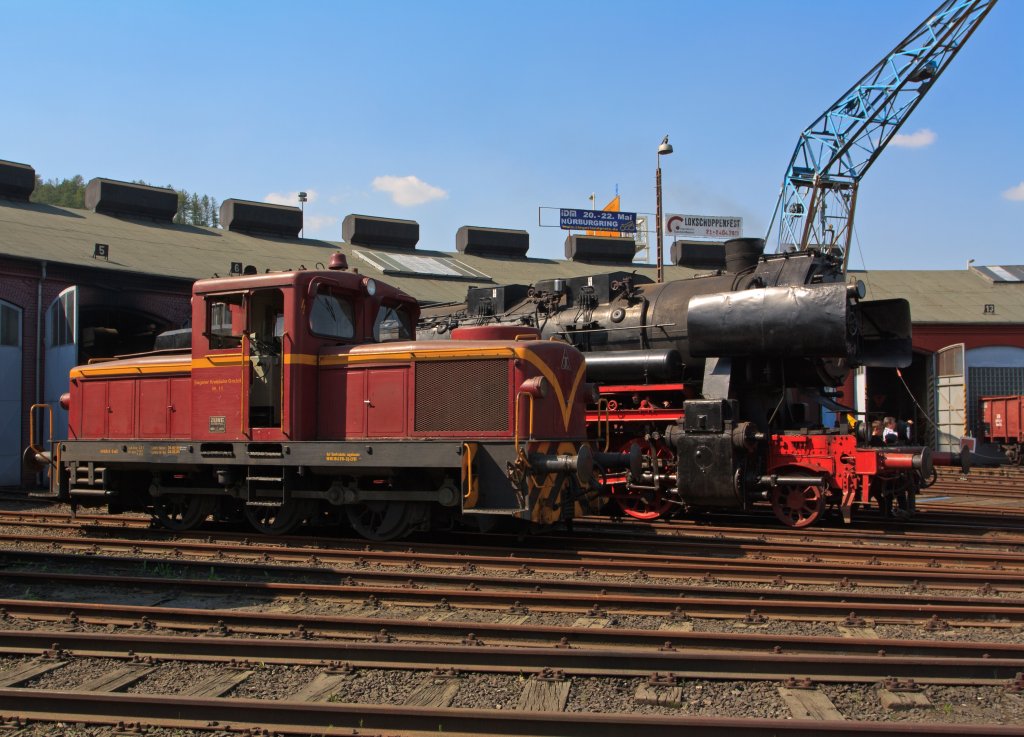 Die ehem. Siegener Kreisbahn Lok 11 am 23.04.2010 im Südwestfälischen Eisenbahnmuseum. Die Lok vom Typ R 42 C wurde 1960 bei der Firma Jung in Jungenthal bei Kirchen/Sieg gebaut. Dahinter seht die 52 8134-0 der Eisenbahnfreunde Betzdorf.