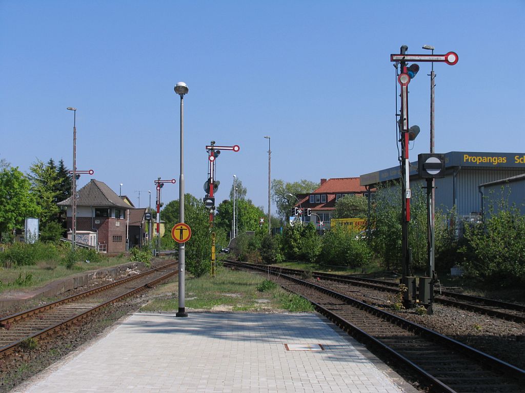 Vier Flügelsignale und die Blockstelle auf Bahnhof Soltau am 3-5-2011.